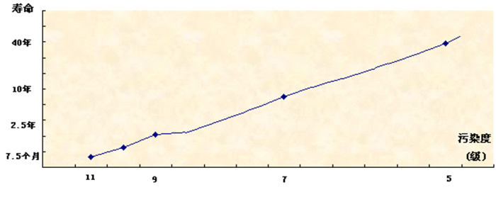 世界各研究機構在進行研究污染度對壽命的影響時,所給出的研究結果差異很大,這主要是因為工作環境、污染物成分及顆粒硬度等因素不同的結果。一般來說(以NAS1638標準),污染度降低一級,壽命延長一倍,反之亦然。假定使用污染度為7級(NAS1638)的油液,機器的壽命為10年,同樣是這樣一臺機器將油液的污染度降低幾級,壽命就有驚人的變化。